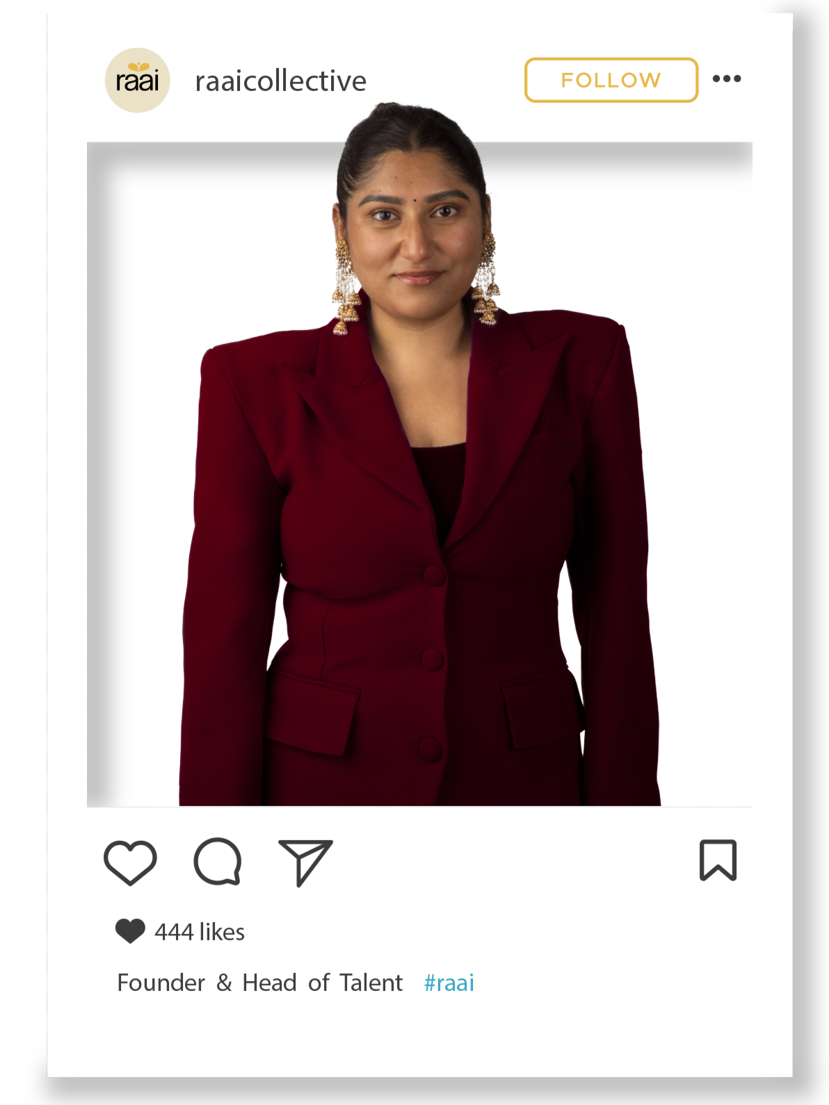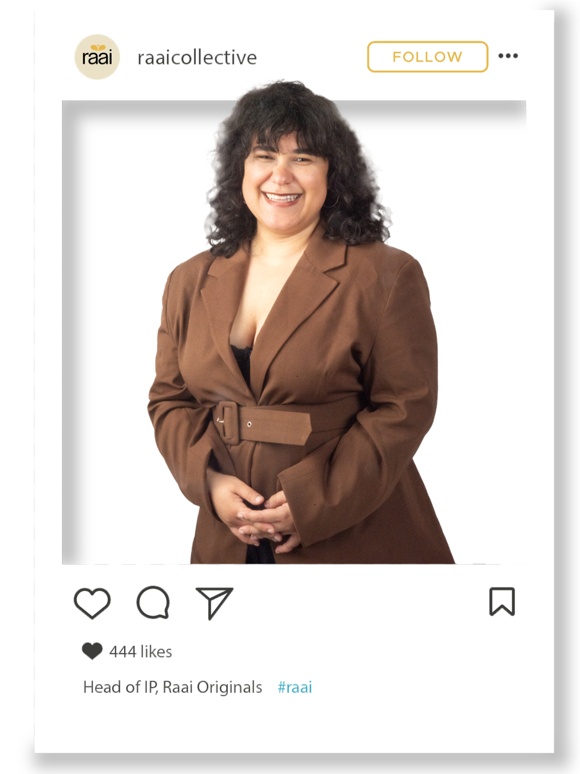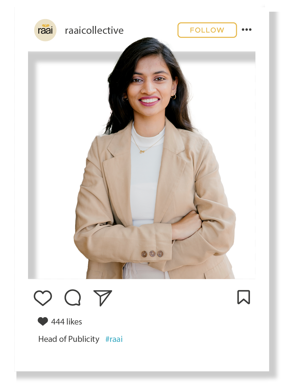 Meet the team Ahana Ghosh Panchali Saha Selena Beaumont Sruthi Dhulipala Neha Tiwari Rishabh Dudhedia For inquiries about our creative, brand, or production services, please contact info@raai.co